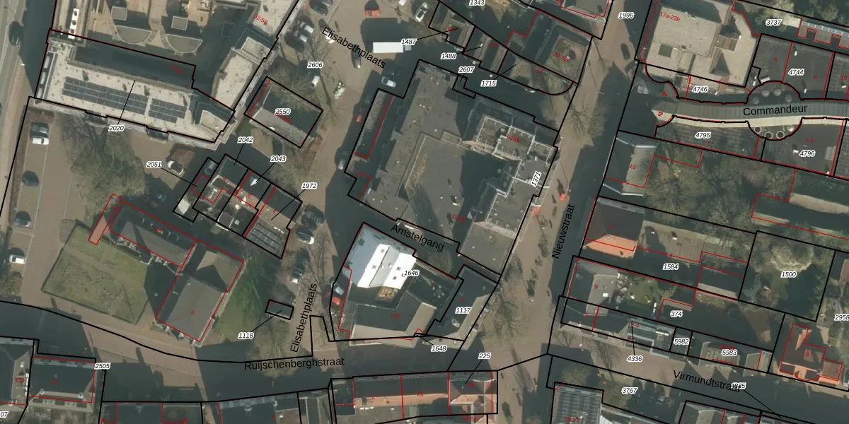 Het perceel waarop Elisabethplaats 19 staat heeft een oppervlakte van 1472 m². Dit is een zeer groot perceel. De perceeloppervlakte wordt geregistreerd door het Kadaster. Gedetailleerde informatie over de maten van dit perceel kunt u vinden in het rapport Kadastrale kaart met maatvoering van Elisabethplaats 19.