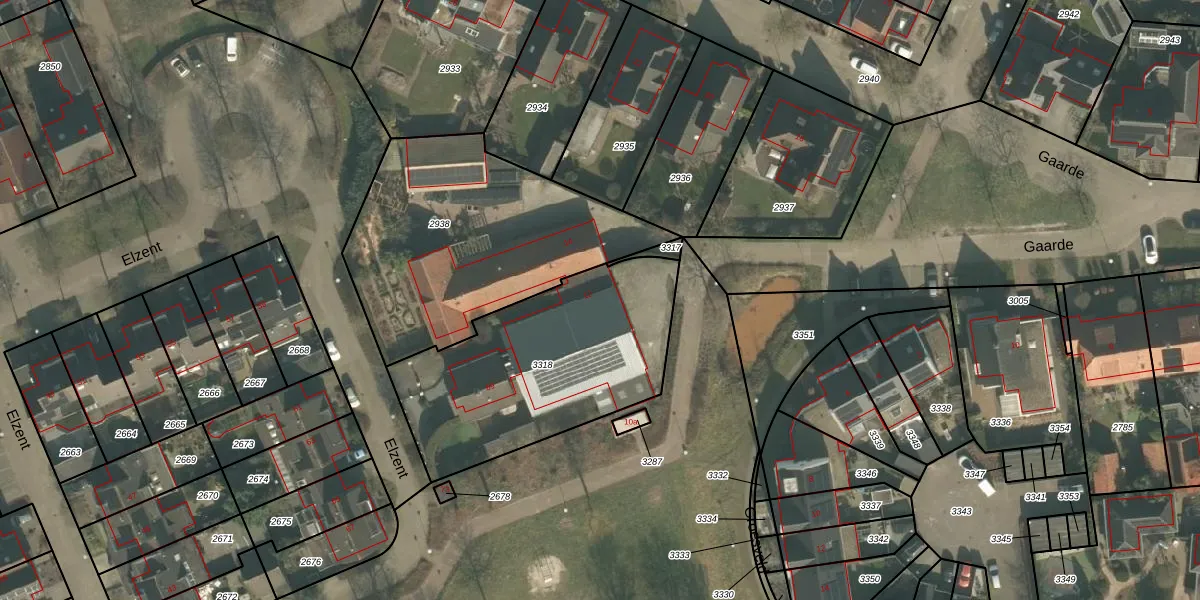 Het perceel waarop Gaarde 12 staat heeft een oppervlakte van 1042 m². Dit is een zeer groot perceel. De perceeloppervlakte wordt geregistreerd door het Kadaster. Gedetailleerde informatie over de maten van dit perceel kunt u vinden in het rapport Kadastrale kaart met maatvoering van Gaarde 12.