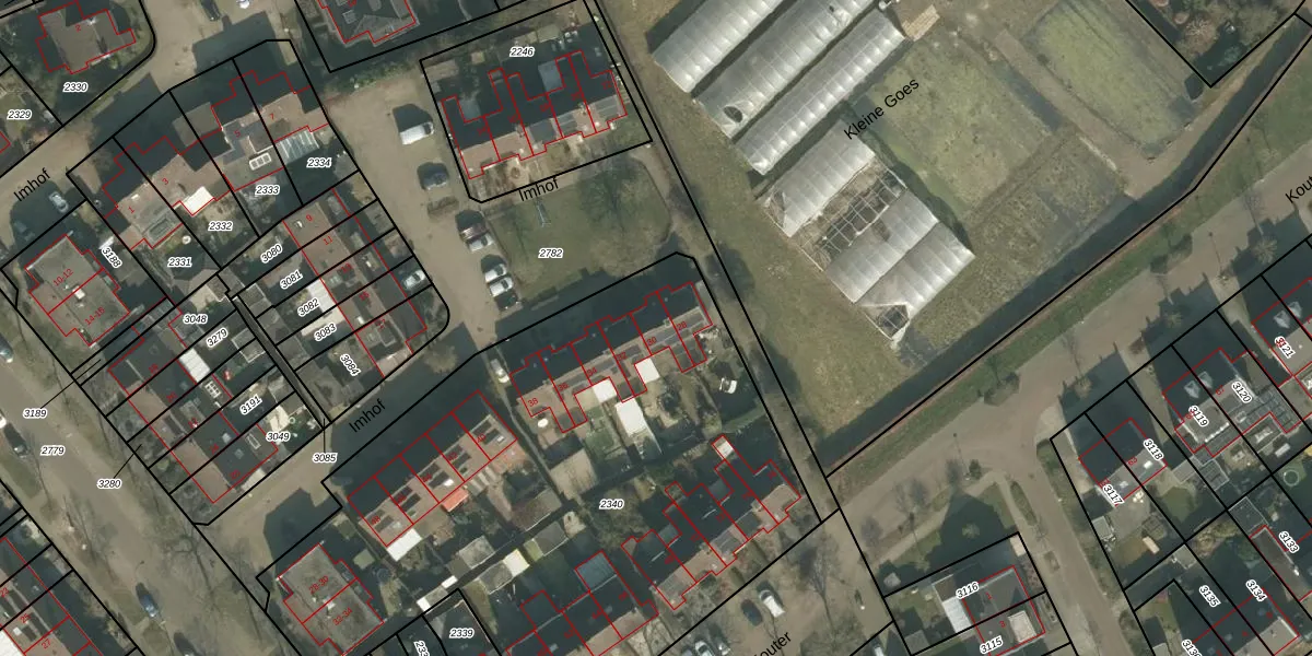 Het perceel waarop Imhof 30 staat heeft een oppervlakte van 3363 m². Dit is een zeer groot perceel. De perceeloppervlakte wordt geregistreerd door het Kadaster. Gedetailleerde informatie over de maten van dit perceel kunt u vinden in het rapport Kadastrale kaart met maatvoering van Imhof 30.