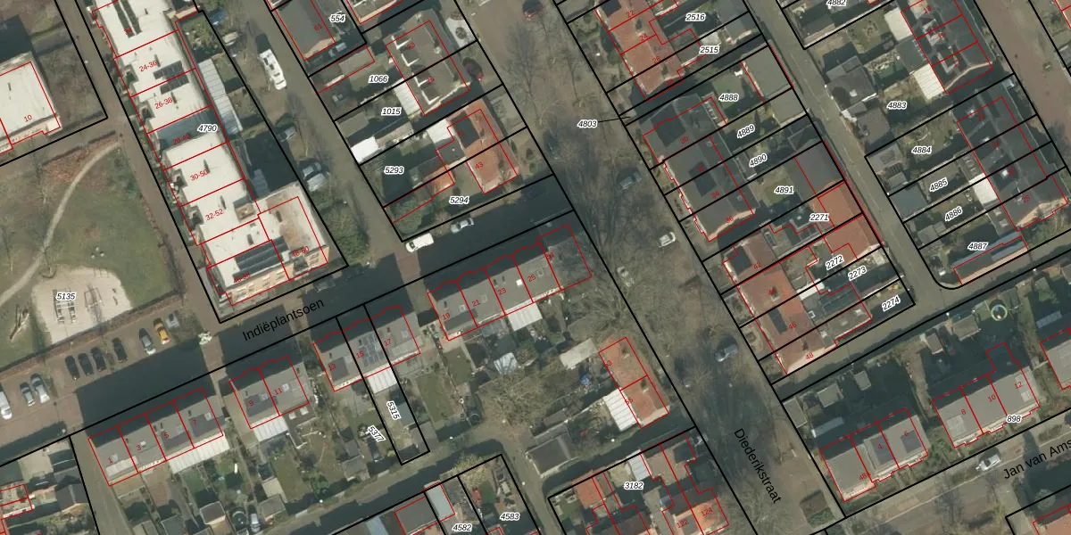 Het perceel waarop Indiëplantsoen 25 staat heeft een oppervlakte van 4451 m². Dit is een zeer groot perceel. De perceeloppervlakte wordt geregistreerd door het Kadaster. Gedetailleerde informatie over de maten van dit perceel kunt u vinden in het rapport Kadastrale kaart met maatvoering van Indiëplantsoen 25.