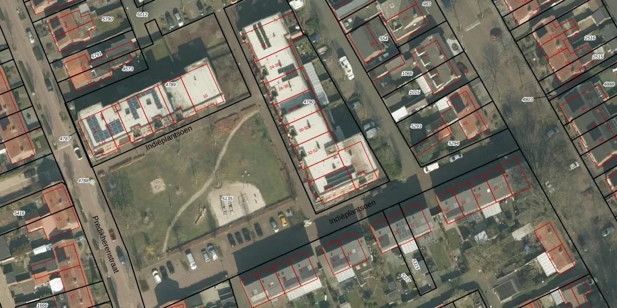 Het perceel waarop Indiëplantsoen 32 staat heeft een oppervlakte van 1654 m². Dit is een zeer groot perceel. De perceeloppervlakte wordt geregistreerd door het Kadaster. Gedetailleerde informatie over de maten van dit perceel kunt u vinden in het rapport Kadastrale kaart met maatvoering van Indiëplantsoen 32.