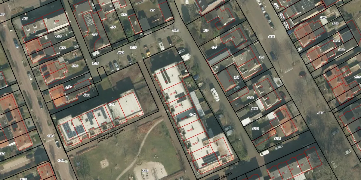 Het perceel waarop Indiëplantsoen 36 staat heeft een oppervlakte van 1654 m². Dit is een zeer groot perceel. De perceeloppervlakte wordt geregistreerd door het Kadaster. Gedetailleerde informatie over de maten van dit perceel kunt u vinden in het rapport Kadastrale kaart met maatvoering van Indiëplantsoen 36.