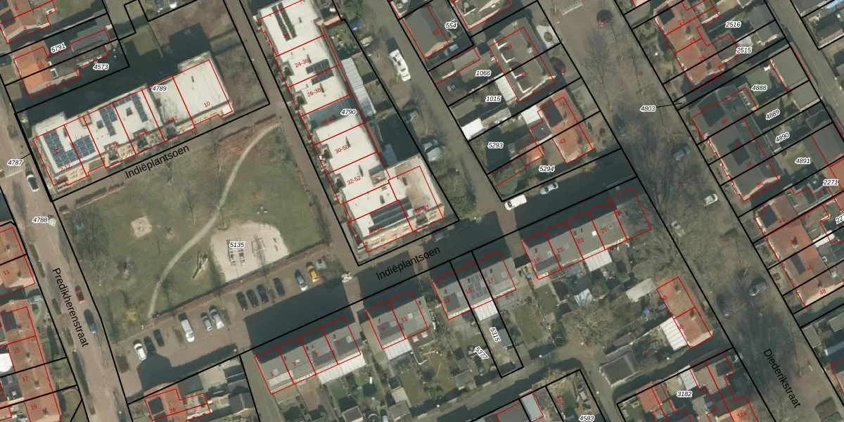 Het perceel waarop Indiëplantsoen 60 staat heeft een oppervlakte van 1654 m². Dit is een zeer groot perceel. De perceeloppervlakte wordt geregistreerd door het Kadaster. Gedetailleerde informatie over de maten van dit perceel kunt u vinden in het rapport Kadastrale kaart met maatvoering van Indiëplantsoen 60.