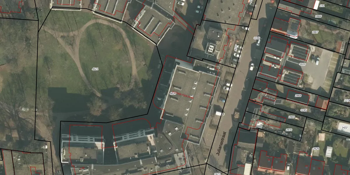 Het perceel waarop Julianastraat 2-T128 staat heeft een oppervlakte van 8605 m². Dit is een zeer groot perceel. De perceeloppervlakte wordt geregistreerd door het Kadaster. Gedetailleerde informatie over de maten van dit perceel kunt u vinden in het rapport Kadastrale kaart met maatvoering van Julianastraat 2-T128.
