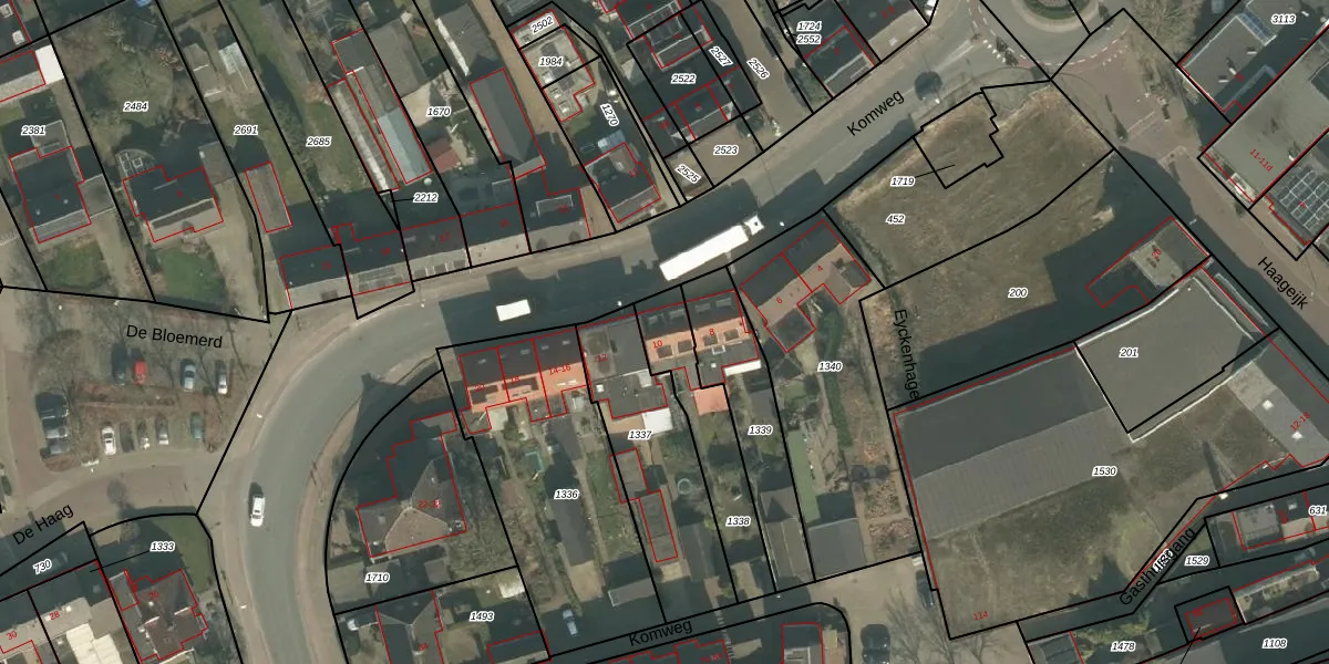 Komweg 10 is gelegen op kadastraal perceel GMT00N1338. Deze kadastrale aanduiding is uniek en wordt gebruikt door het Kadaster om eigendomsrechten en andere zakelijke rechten vast te leggen. Het perceel maakt onderdeel uit van de kadastrale gemeente Gemert.