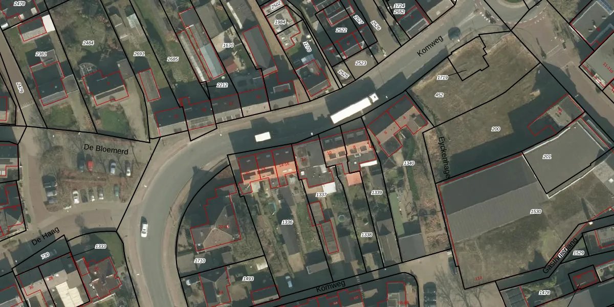 Het perceel waarop Komweg 12 staat heeft een oppervlakte van 535 m². Dit is een groot perceel. De perceeloppervlakte wordt geregistreerd door het Kadaster. Gedetailleerde informatie over de maten van dit perceel kunt u vinden in het rapport Kadastrale kaart met maatvoering van Komweg 12.