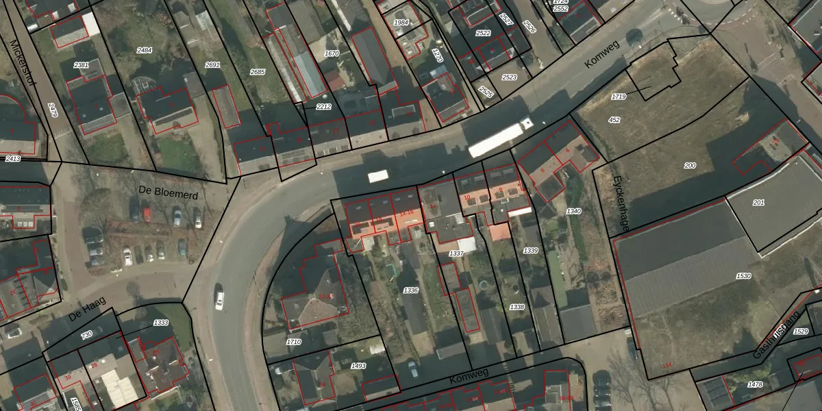 Het perceel waarop Komweg 14 staat heeft een oppervlakte van 935 m². Dit is een groot perceel. De perceeloppervlakte wordt geregistreerd door het Kadaster. Gedetailleerde informatie over de maten van dit perceel kunt u vinden in het rapport Kadastrale kaart met maatvoering van Komweg 14.