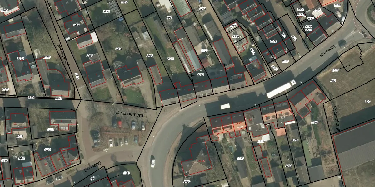Komweg 19 is gelegen op kadastraal perceel GMT00N2685. Deze kadastrale aanduiding is uniek en wordt gebruikt door het Kadaster om eigendomsrechten en andere zakelijke rechten vast te leggen. Het perceel maakt onderdeel uit van de kadastrale gemeente Gemert.