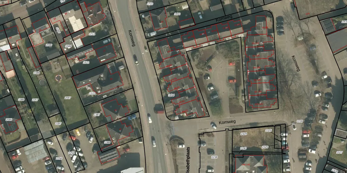 Het perceel waarop Komweg 46 staat heeft een oppervlakte van 2494 m². Dit is een zeer groot perceel. De perceeloppervlakte wordt geregistreerd door het Kadaster. Gedetailleerde informatie over de maten van dit perceel kunt u vinden in het rapport Kadastrale kaart met maatvoering van Komweg 46.