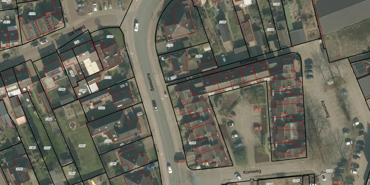 Het perceel waarop Komweg 64 staat heeft een oppervlakte van 2494 m². Dit is een zeer groot perceel. De perceeloppervlakte wordt geregistreerd door het Kadaster. Gedetailleerde informatie over de maten van dit perceel kunt u vinden in het rapport Kadastrale kaart met maatvoering van Komweg 64.