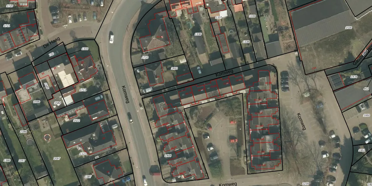 Het perceel waarop Komweg 76 staat heeft een oppervlakte van 2494 m². Dit is een zeer groot perceel. De perceeloppervlakte wordt geregistreerd door het Kadaster. Gedetailleerde informatie over de maten van dit perceel kunt u vinden in het rapport Kadastrale kaart met maatvoering van Komweg 76.