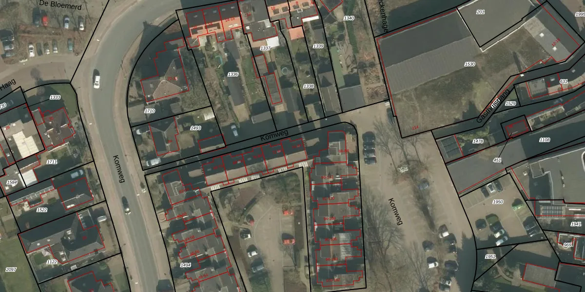 Het perceel waarop Komweg 84 staat heeft een oppervlakte van 2494 m². Dit is een zeer groot perceel. De perceeloppervlakte wordt geregistreerd door het Kadaster. Gedetailleerde informatie over de maten van dit perceel kunt u vinden in het rapport Kadastrale kaart met maatvoering van Komweg 84.