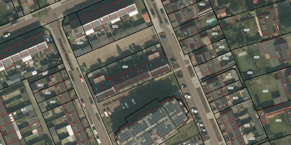 Het perceel waarop Maria Aertshof 41 staat heeft een oppervlakte van 1165 m². Dit is een zeer groot perceel. De perceeloppervlakte wordt geregistreerd door het Kadaster. Gedetailleerde informatie over de maten van dit perceel kunt u vinden in het rapport Kadastrale kaart met maatvoering van Maria Aertshof 41.