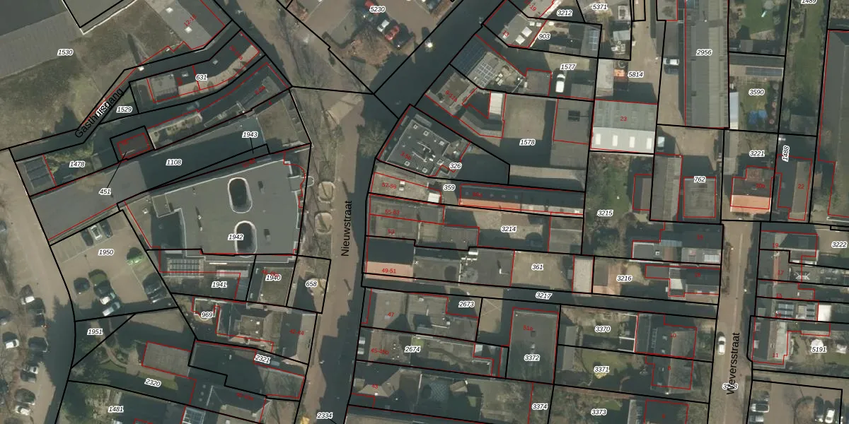 Het perceel waarop Nieuwstraat 63 staat heeft een oppervlakte van 484 m². Dit is een groot perceel. De perceeloppervlakte wordt geregistreerd door het Kadaster. Gedetailleerde informatie over de maten van dit perceel kunt u vinden in het rapport Kadastrale kaart met maatvoering van Nieuwstraat 63.