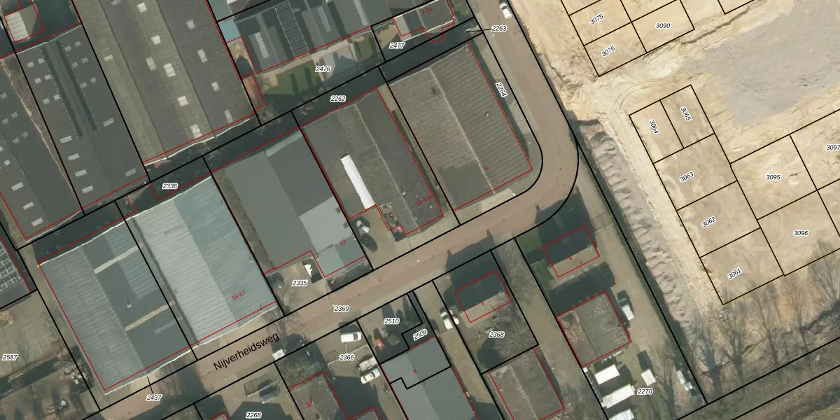 Het perceel waarop Nijverheidsweg 11-a staat heeft een oppervlakte van 996 m². Dit is een groot perceel. De perceeloppervlakte wordt geregistreerd door het Kadaster. Gedetailleerde informatie over de maten van dit perceel kunt u vinden in het rapport Kadastrale kaart met maatvoering van Nijverheidsweg 11-a.