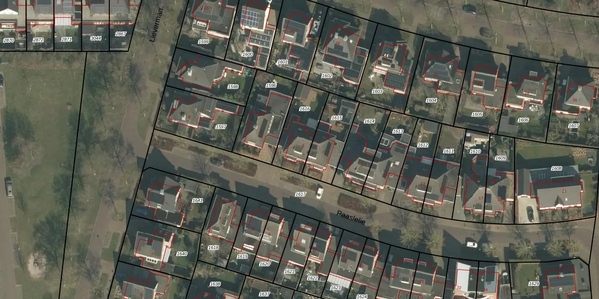 Paaslelie 5 is gelegen op kadastraal perceel GMT00O1616. Deze kadastrale aanduiding is uniek en wordt gebruikt door het Kadaster om eigendomsrechten en andere zakelijke rechten vast te leggen. Het perceel maakt onderdeel uit van de kadastrale gemeente Gemert.