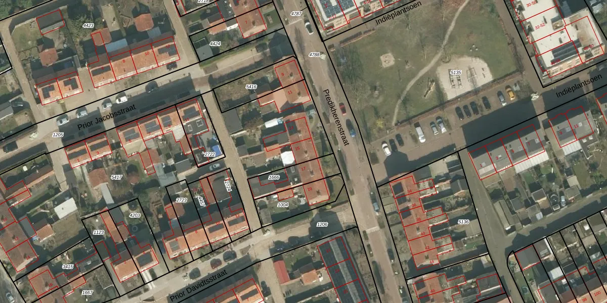 Het perceel waarop Predikherenstraat 15 staat heeft een oppervlakte van 3285 m². Dit is een zeer groot perceel. De perceeloppervlakte wordt geregistreerd door het Kadaster. Gedetailleerde informatie over de maten van dit perceel kunt u vinden in het rapport Kadastrale kaart met maatvoering van Predikherenstraat 15.