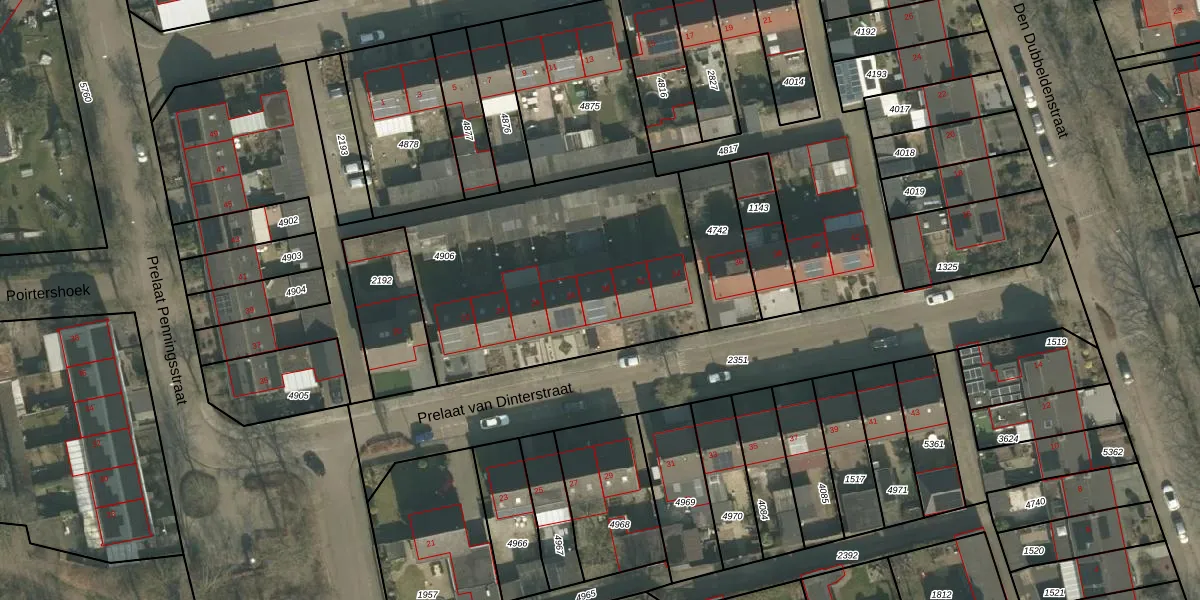 Prelaat van Dinterstraat 30 is gelegen op kadastraal perceel GMT00M4906. Deze kadastrale aanduiding is uniek en wordt gebruikt door het Kadaster om eigendomsrechten en andere zakelijke rechten vast te leggen. Het perceel maakt onderdeel uit van de kadastrale gemeente Gemert.