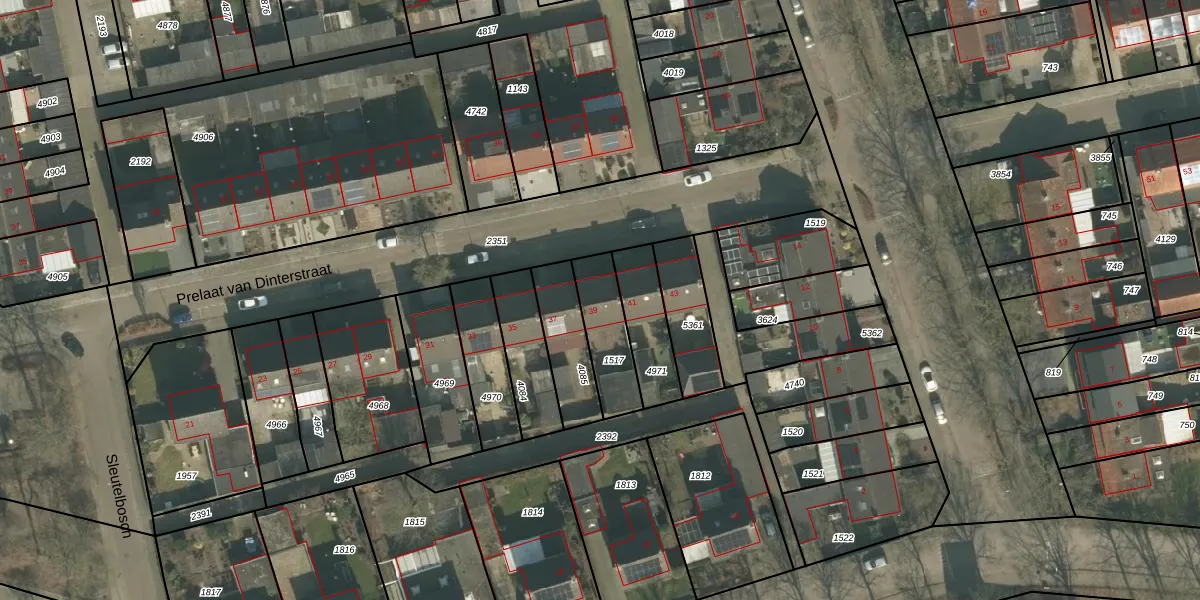 Het perceel waarop Prelaat van Dinterstraat 39 staat heeft een oppervlakte van 187 m². Dit is een middelgroot perceel. De perceeloppervlakte wordt geregistreerd door het Kadaster. Gedetailleerde informatie over de maten van dit perceel kunt u vinden in het rapport Kadastrale kaart met maatvoering van Prelaat van Dinterstraat 39.
