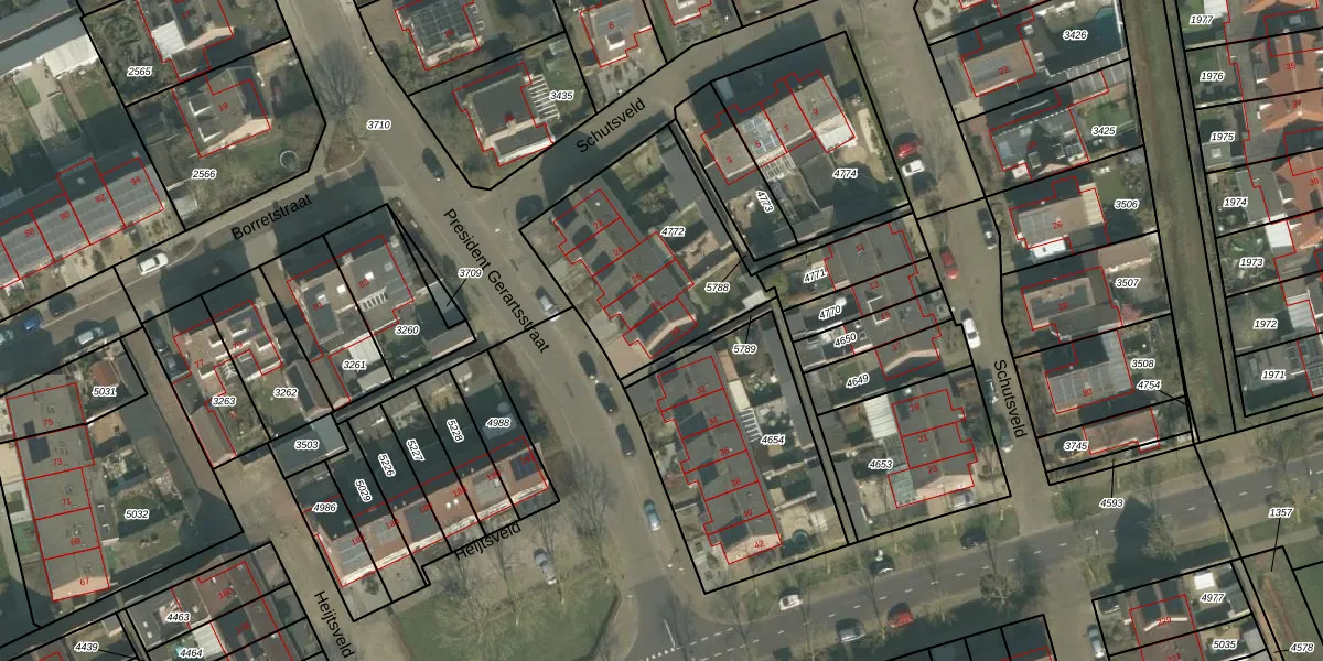 Het perceel waarop President Gerartsstraat 30 staat heeft een oppervlakte van 760 m². Dit is een groot perceel. De perceeloppervlakte wordt geregistreerd door het Kadaster. Gedetailleerde informatie over de maten van dit perceel kunt u vinden in het rapport Kadastrale kaart met maatvoering van President Gerartsstraat 30.