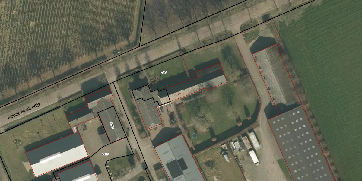 Het perceel waarop Rooije-Hoefsedijk 49 staat heeft een oppervlakte van 8,8 ha. Dit is een zeer groot perceel. De perceeloppervlakte wordt geregistreerd door het Kadaster. Gedetailleerde informatie over de maten van dit perceel kunt u vinden in het rapport Kadastrale kaart met maatvoering van Rooije-Hoefsedijk 49.