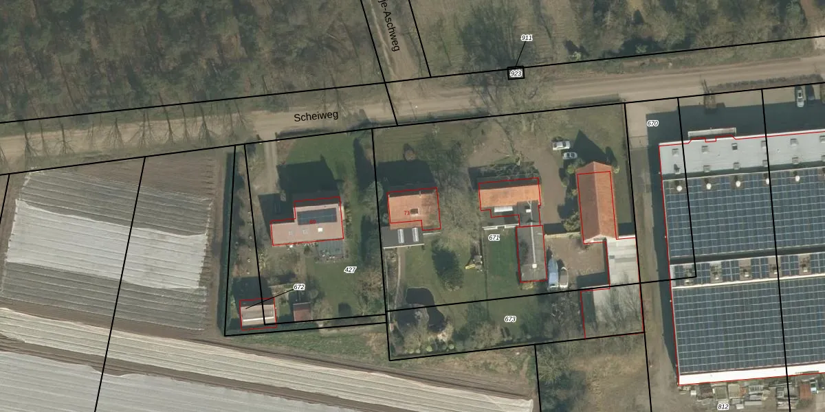 Scheiweg 71 is gelegen op kadastraal perceel GMT00O671. Deze kadastrale aanduiding is uniek en wordt gebruikt door het Kadaster om eigendomsrechten en andere zakelijke rechten vast te leggen. Het perceel maakt onderdeel uit van de kadastrale gemeente Gemert.
