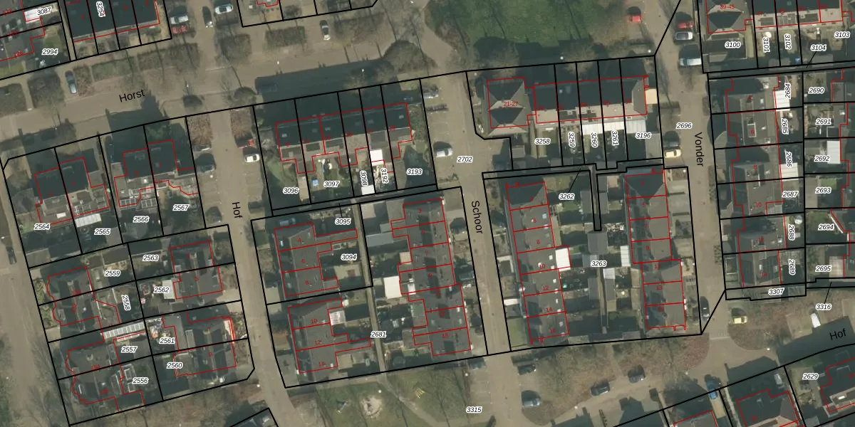 Het perceel waarop Schoor 3 staat heeft een oppervlakte van 1460 m². Dit is een zeer groot perceel. De perceeloppervlakte wordt geregistreerd door het Kadaster. Gedetailleerde informatie over de maten van dit perceel kunt u vinden in het rapport Kadastrale kaart met maatvoering van Schoor 3.