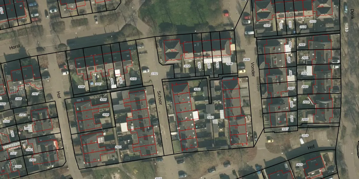 Het perceel waarop Schoor 4 staat heeft een oppervlakte van 1835 m². Dit is een zeer groot perceel. De perceeloppervlakte wordt geregistreerd door het Kadaster. Gedetailleerde informatie over de maten van dit perceel kunt u vinden in het rapport Kadastrale kaart met maatvoering van Schoor 4.