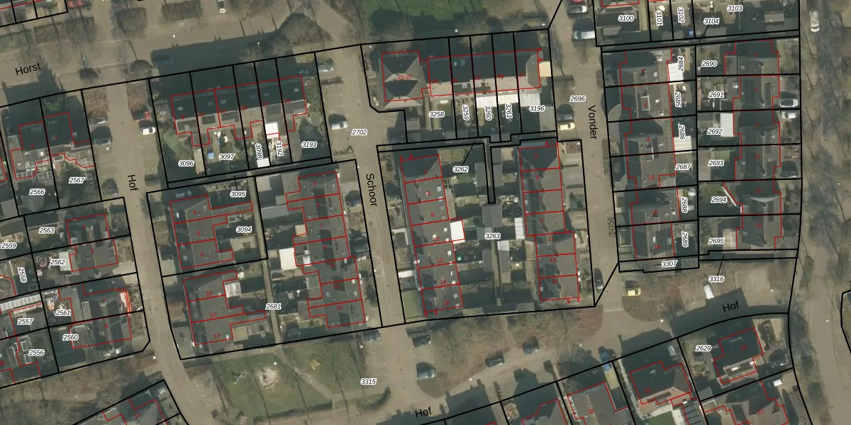 Het perceel waarop Schoor 8 staat heeft een oppervlakte van 1835 m². Dit is een zeer groot perceel. De perceeloppervlakte wordt geregistreerd door het Kadaster. Gedetailleerde informatie over de maten van dit perceel kunt u vinden in het rapport Kadastrale kaart met maatvoering van Schoor 8.