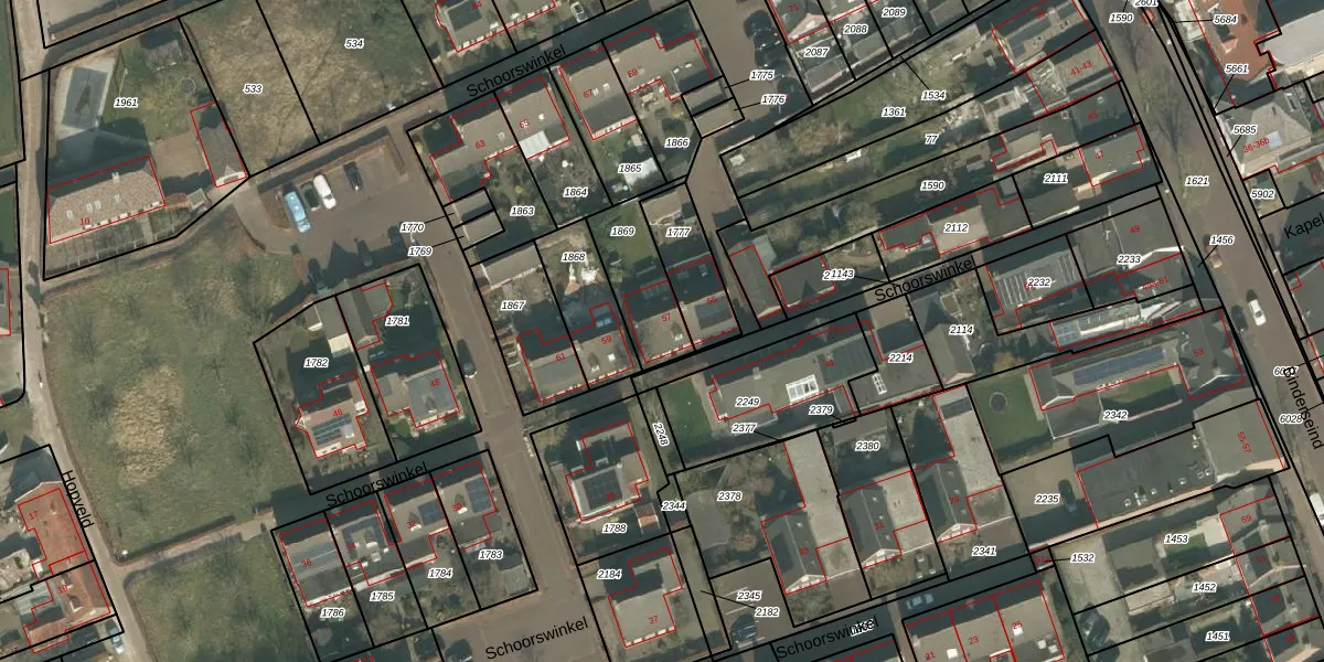 Schoorswinkel 57 is gelegen op kadastraal perceel GMT00N1869. Deze kadastrale aanduiding is uniek en wordt gebruikt door het Kadaster om eigendomsrechten en andere zakelijke rechten vast te leggen. Het perceel maakt onderdeel uit van de kadastrale gemeente Gemert.