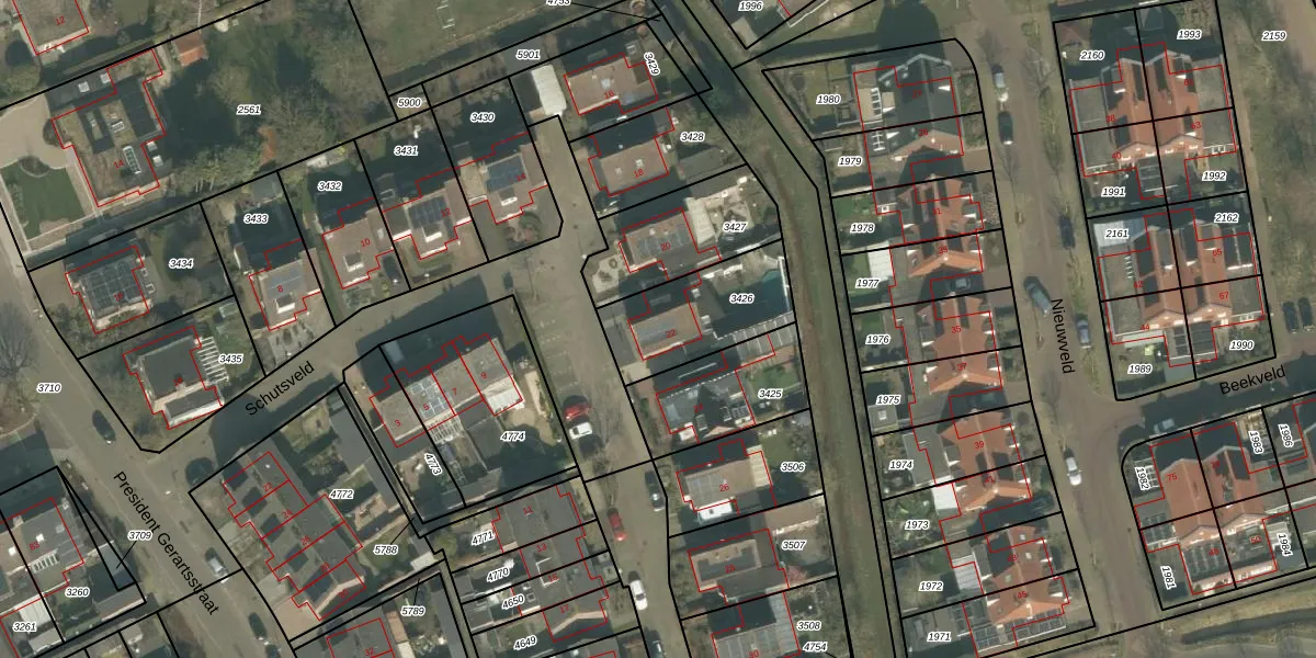 Het perceel waarop Schutsveld 22 staat heeft een oppervlakte van 365 m². Dit is een groot perceel. De perceeloppervlakte wordt geregistreerd door het Kadaster. Gedetailleerde informatie over de maten van dit perceel kunt u vinden in het rapport Kadastrale kaart met maatvoering van Schutsveld 22.