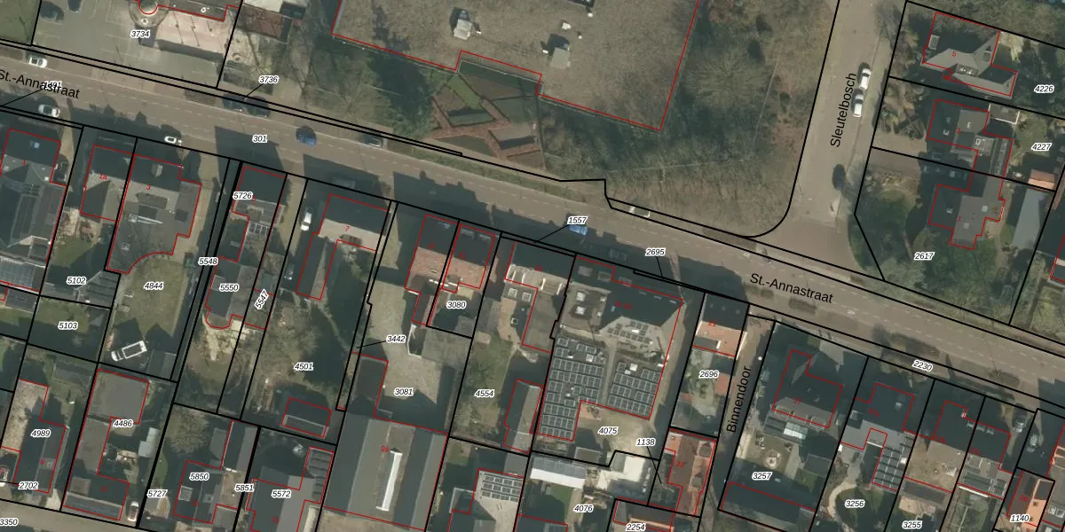 Het perceel waarop St.-Annastraat 13 staat heeft een oppervlakte van 591 m². Dit is een groot perceel. De perceeloppervlakte wordt geregistreerd door het Kadaster. Gedetailleerde informatie over de maten van dit perceel kunt u vinden in het rapport Kadastrale kaart met maatvoering van St.-Annastraat 13.