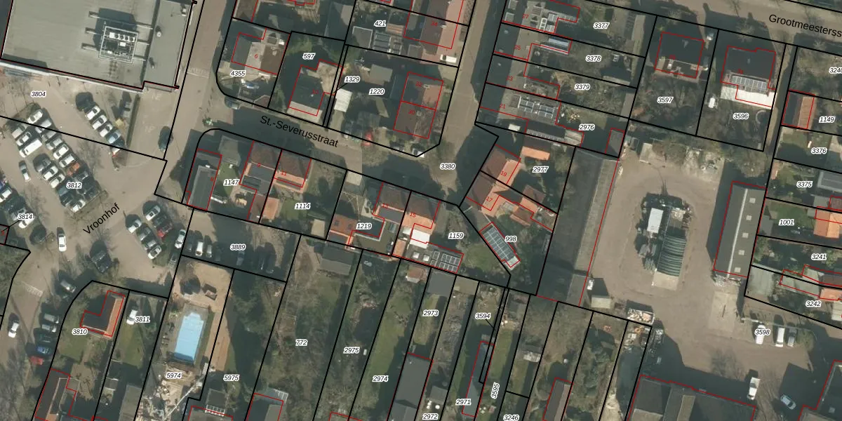 Het perceel waarop St.-Severusstraat 15 staat heeft een oppervlakte van 350 m². Dit is een groot perceel. De perceeloppervlakte wordt geregistreerd door het Kadaster. Gedetailleerde informatie over de maten van dit perceel kunt u vinden in het rapport Kadastrale kaart met maatvoering van St.-Severusstraat 15.