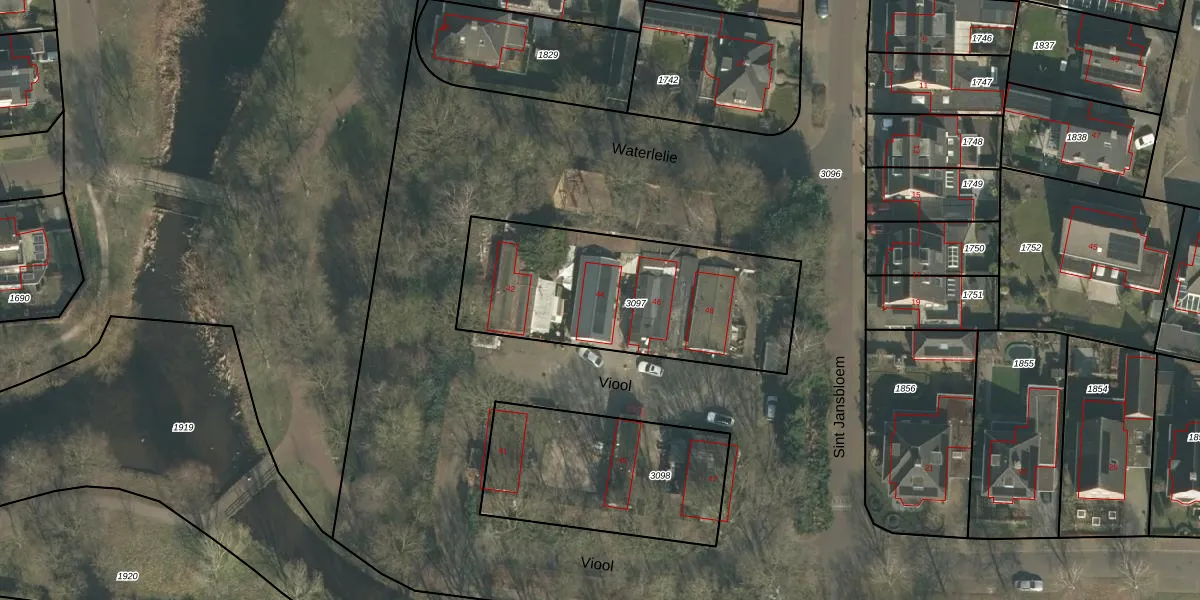 Het perceel waarop Viool 44 staat heeft een oppervlakte van 1055 m². Dit is een zeer groot perceel. De perceeloppervlakte wordt geregistreerd door het Kadaster. Gedetailleerde informatie over de maten van dit perceel kunt u vinden in het rapport Kadastrale kaart met maatvoering van Viool 44.