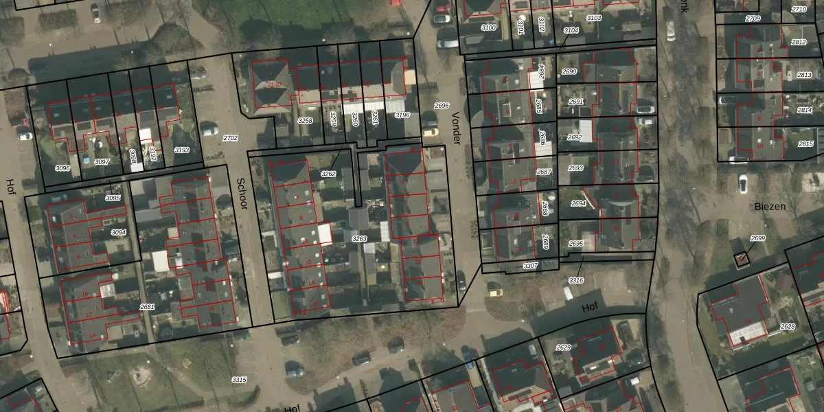 Het perceel waarop Vonder 7 staat heeft een oppervlakte van 1835 m². Dit is een zeer groot perceel. De perceeloppervlakte wordt geregistreerd door het Kadaster. Gedetailleerde informatie over de maten van dit perceel kunt u vinden in het rapport Kadastrale kaart met maatvoering van Vonder 7.