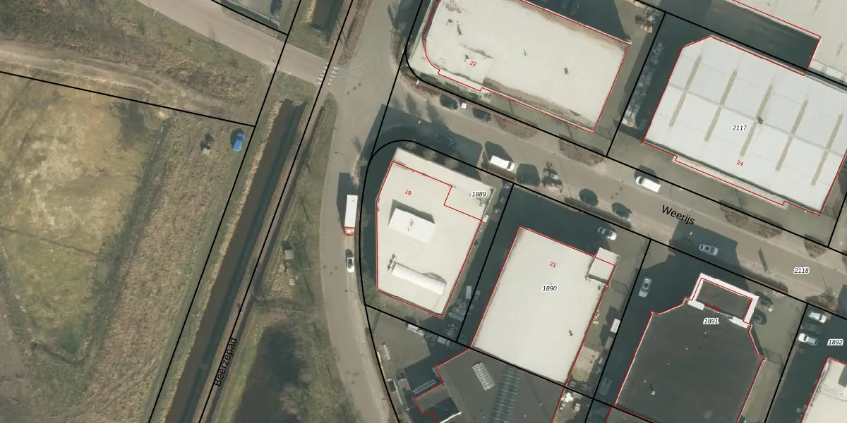 Het perceel waarop Weerijs 19 staat heeft een oppervlakte van 1207 m². Dit is een zeer groot perceel. De perceeloppervlakte wordt geregistreerd door het Kadaster. Gedetailleerde informatie over de maten van dit perceel kunt u vinden in het rapport Kadastrale kaart met maatvoering van Weerijs 19.