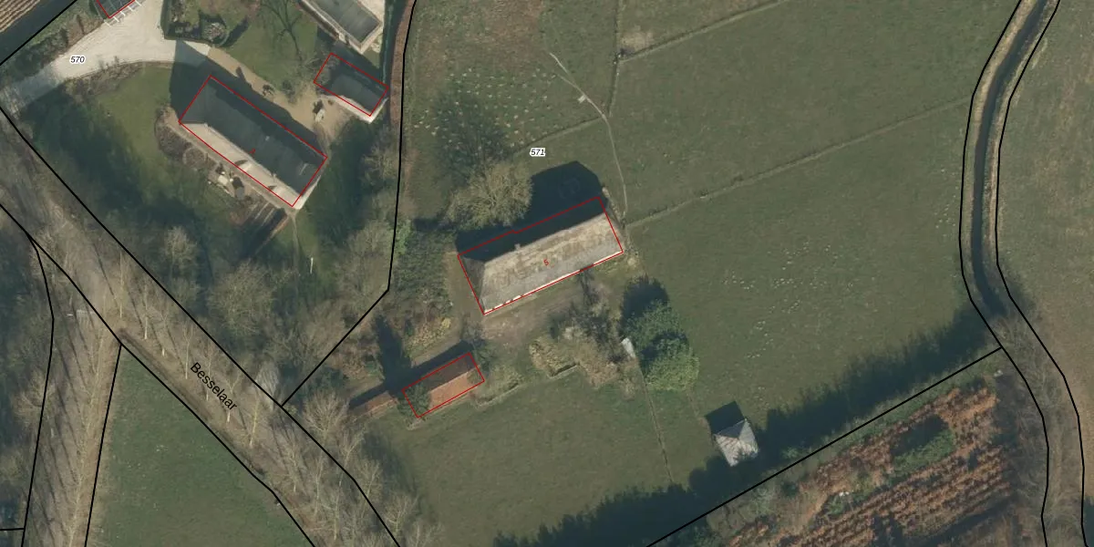 Het perceel waarop Besselaar 5 staat heeft een oppervlakte van 1,6 ha. Dit is een zeer groot perceel. De perceeloppervlakte wordt geregistreerd door het Kadaster. Gedetailleerde informatie over de maten van dit perceel kunt u vinden in het rapport Kadastrale kaart met maatvoering van Besselaar 5.