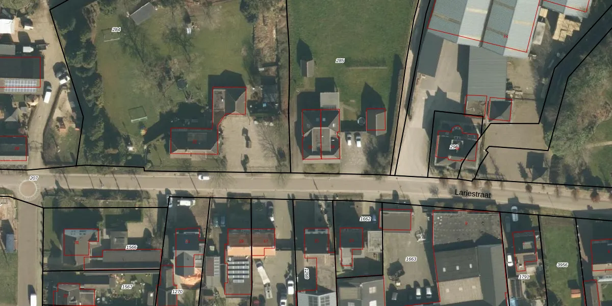 Lariestraat 20 is gelegen op kadastraal perceel MCG00O285. Deze kadastrale aanduiding is uniek en wordt gebruikt door het Kadaster om eigendomsrechten en andere zakelijke rechten vast te leggen. Het perceel maakt onderdeel uit van de kadastrale gemeente Sint Michielsgestel.