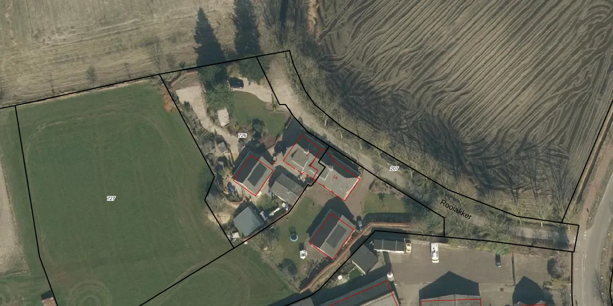 Het perceel waarop Rooiakker 1 staat heeft een oppervlakte van 1840 m². Dit is een zeer groot perceel. De perceeloppervlakte wordt geregistreerd door het Kadaster. Gedetailleerde informatie over de maten van dit perceel kunt u vinden in het rapport Kadastrale kaart met maatvoering van Rooiakker 1.