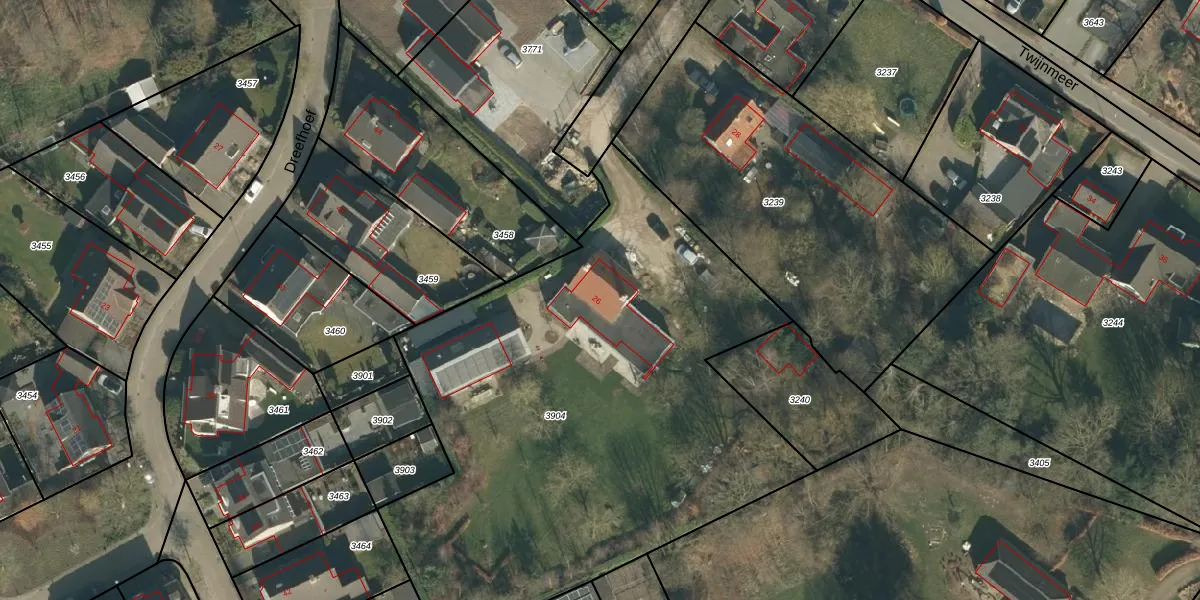 Het perceel waarop Twijnmeer 26 staat heeft een oppervlakte van 3291 m². Dit is een zeer groot perceel. De perceeloppervlakte wordt geregistreerd door het Kadaster. Gedetailleerde informatie over de maten van dit perceel kunt u vinden in het rapport Kadastrale kaart met maatvoering van Twijnmeer 26.