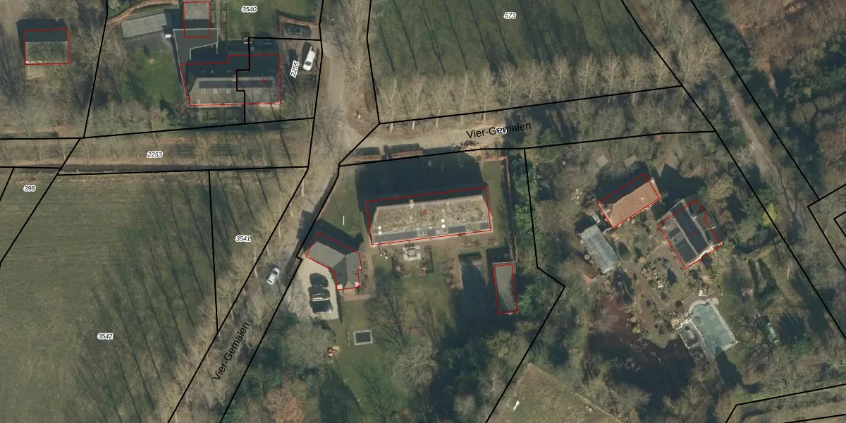 Het perceel waarop Vier-Gemalen 8 staat heeft een oppervlakte van 5765 m². Dit is een zeer groot perceel. De perceeloppervlakte wordt geregistreerd door het Kadaster. Gedetailleerde informatie over de maten van dit perceel kunt u vinden in het rapport Kadastrale kaart met maatvoering van Vier-Gemalen 8.