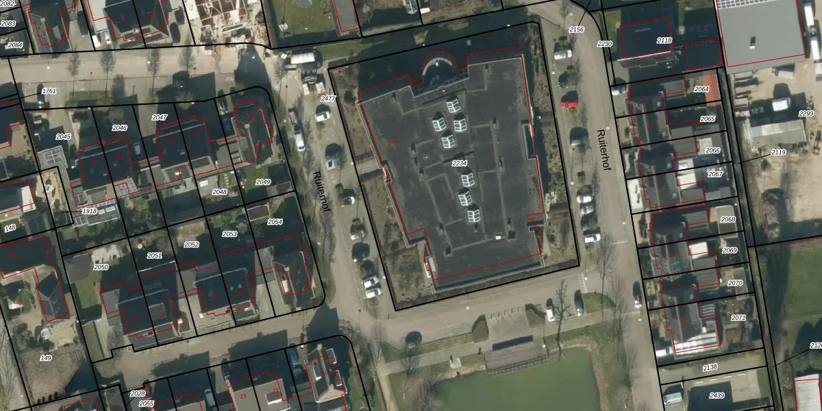 Het perceel waarop Ruiterhof 36 staat heeft een oppervlakte van 3023 m². Dit is een zeer groot perceel. De perceeloppervlakte wordt geregistreerd door het Kadaster. Gedetailleerde informatie over de maten van dit perceel kunt u vinden in het rapport Kadastrale kaart met maatvoering van Ruiterhof 36.
