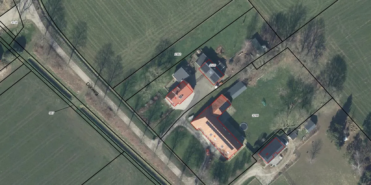 Het perceel waarop Dijkweg 8 staat heeft een oppervlakte van 2045 m². Dit is een zeer groot perceel. De perceeloppervlakte wordt geregistreerd door het Kadaster. Gedetailleerde informatie over de maten van dit perceel kunt u vinden in het rapport Kadastrale kaart met maatvoering van Dijkweg 8.