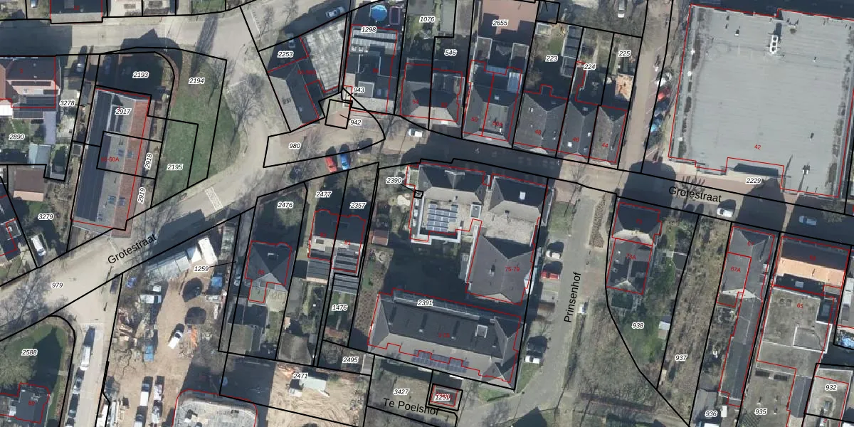 Het perceel waarop Grotestraat 77-H staat heeft een oppervlakte van 1878 m². Dit is een zeer groot perceel. De perceeloppervlakte wordt geregistreerd door het Kadaster. Gedetailleerde informatie over de maten van dit perceel kunt u vinden in het rapport Kadastrale kaart met maatvoering van Grotestraat 77-H.