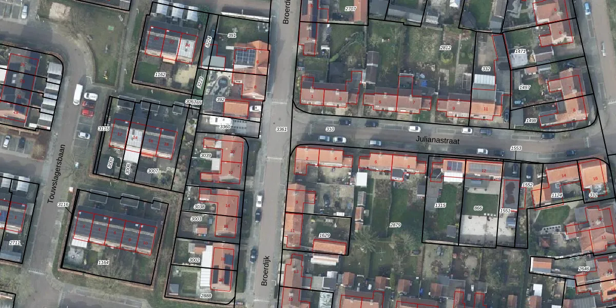 Het perceel waarop Julianastraat 2 staat heeft een oppervlakte van 4205 m². Dit is een zeer groot perceel. De perceeloppervlakte wordt geregistreerd door het Kadaster. Gedetailleerde informatie over de maten van dit perceel kunt u vinden in het rapport Kadastrale kaart met maatvoering van Julianastraat 2.