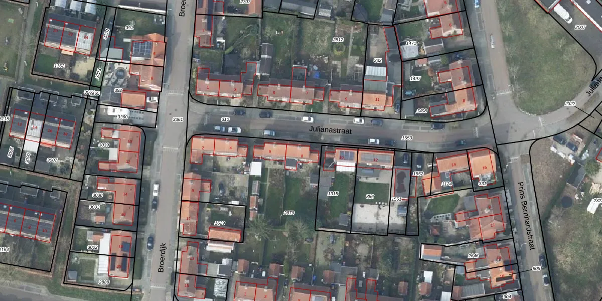 Het perceel waarop Julianastraat 8 staat heeft een oppervlakte van 4205 m². Dit is een zeer groot perceel. De perceeloppervlakte wordt geregistreerd door het Kadaster. Gedetailleerde informatie over de maten van dit perceel kunt u vinden in het rapport Kadastrale kaart met maatvoering van Julianastraat 8.