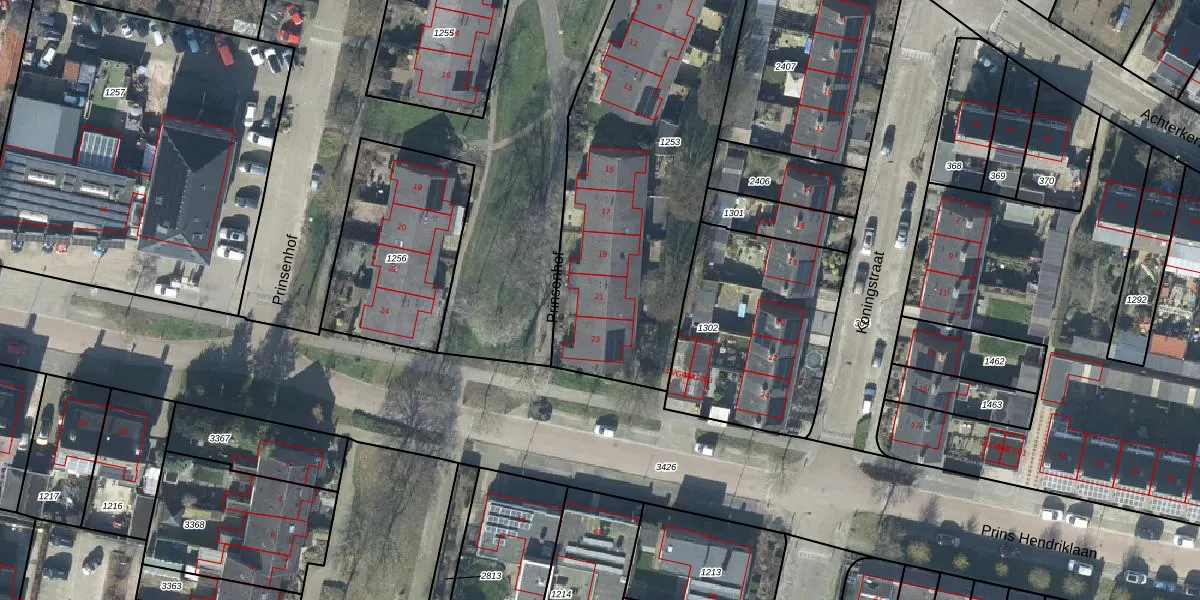 Het perceel waarop Prinsenhof 21 staat heeft een oppervlakte van 1658 m². Dit is een zeer groot perceel. De perceeloppervlakte wordt geregistreerd door het Kadaster. Gedetailleerde informatie over de maten van dit perceel kunt u vinden in het rapport Kadastrale kaart met maatvoering van Prinsenhof 21.