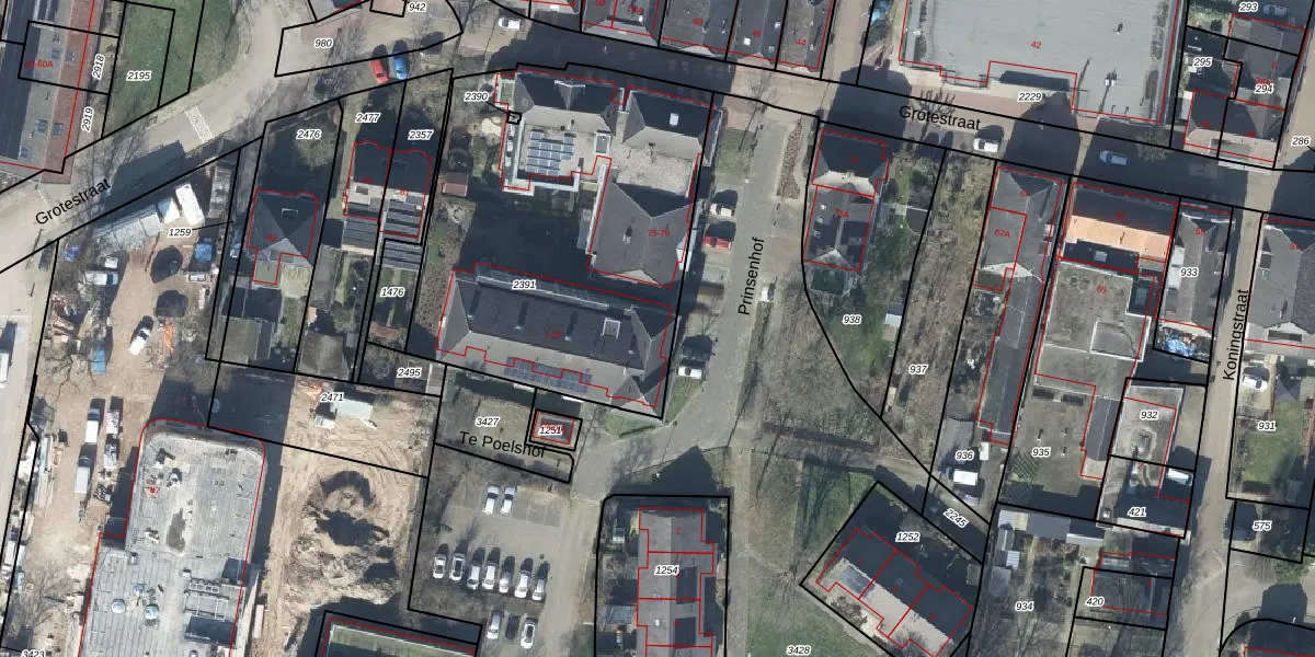 Het perceel waarop Te Poelshof 2 staat heeft een oppervlakte van 1878 m². Dit is een zeer groot perceel. De perceeloppervlakte wordt geregistreerd door het Kadaster. Gedetailleerde informatie over de maten van dit perceel kunt u vinden in het rapport Kadastrale kaart met maatvoering van Te Poelshof 2.