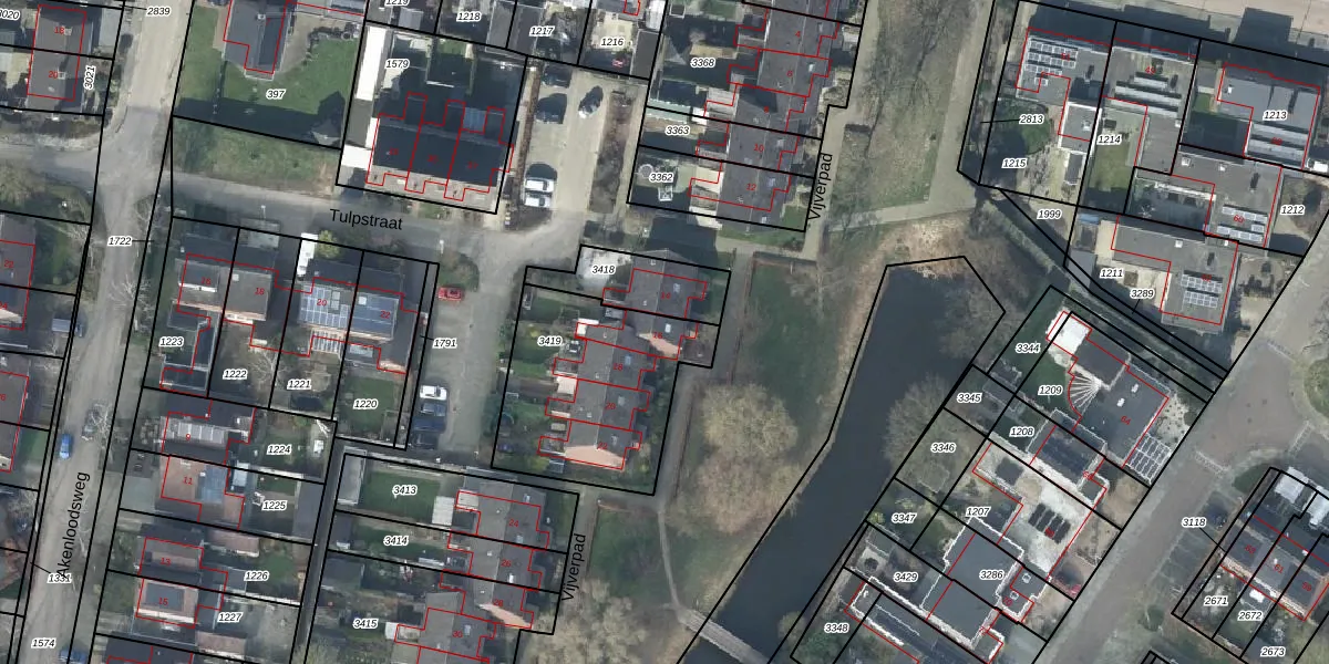 Het perceel waarop Vijverpad 16 staat heeft een oppervlakte van 708 m². Dit is een groot perceel. De perceeloppervlakte wordt geregistreerd door het Kadaster. Gedetailleerde informatie over de maten van dit perceel kunt u vinden in het rapport Kadastrale kaart met maatvoering van Vijverpad 16.
