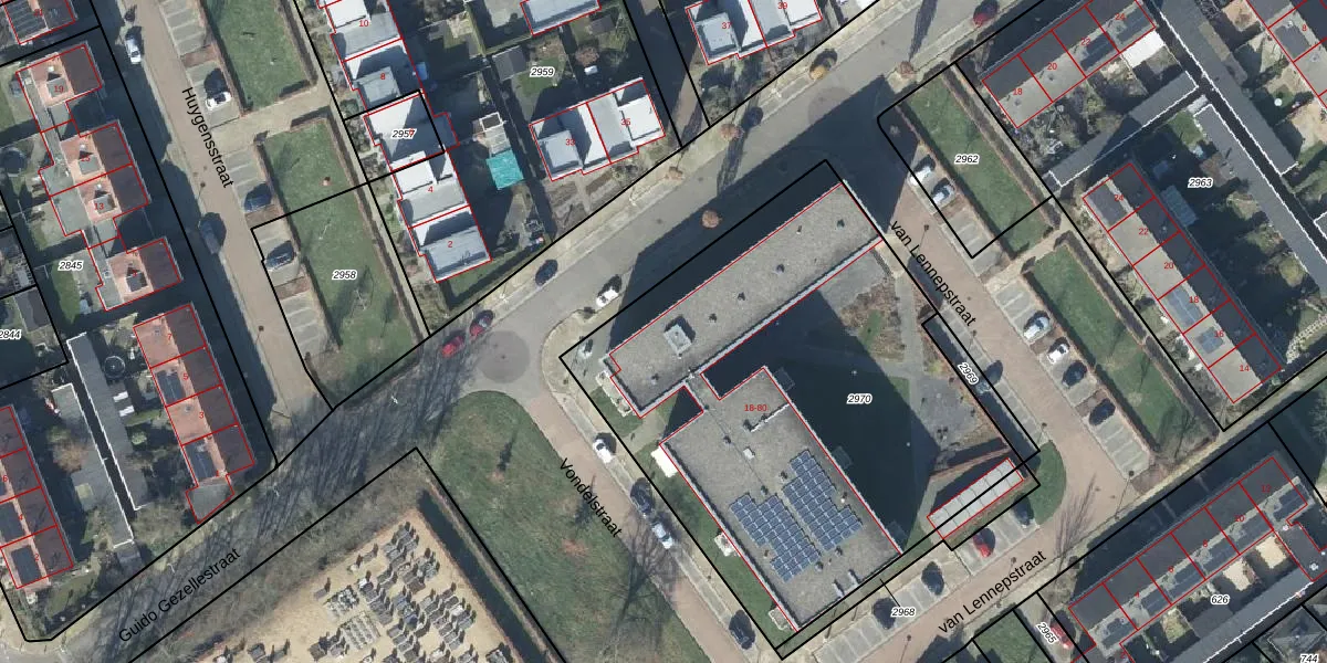 Het perceel waarop Vondelstraat 54 staat heeft een oppervlakte van 2668 m². Dit is een zeer groot perceel. De perceeloppervlakte wordt geregistreerd door het Kadaster. Gedetailleerde informatie over de maten van dit perceel kunt u vinden in het rapport Kadastrale kaart met maatvoering van Vondelstraat 54.